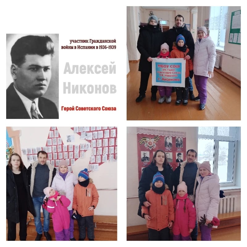 В один из дней зимних каникул МБОУ СОШ им. Героя Советского Союза А.В. Никонова с. Аксеново посетили гости из Межгорья - потомки Героя Советского Союза Алексея Васильевича Никонова. Правнук героя Игорь....Шулаев со своей супругой и тремя детьми прошлись
