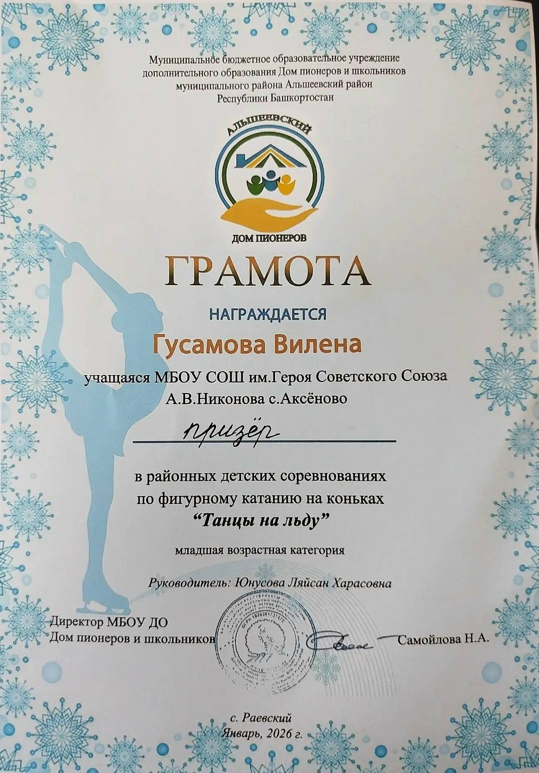 09.01.2026. На катке Дома пионеров состоялись традиционные детские соревнования по фигурному катанию «Танцы на льду — 2026». На лед вышли ученики, которые представляли школы со всего района. В числе участников была обучающаяся 4 класса МБОУ СОШ им. Героя