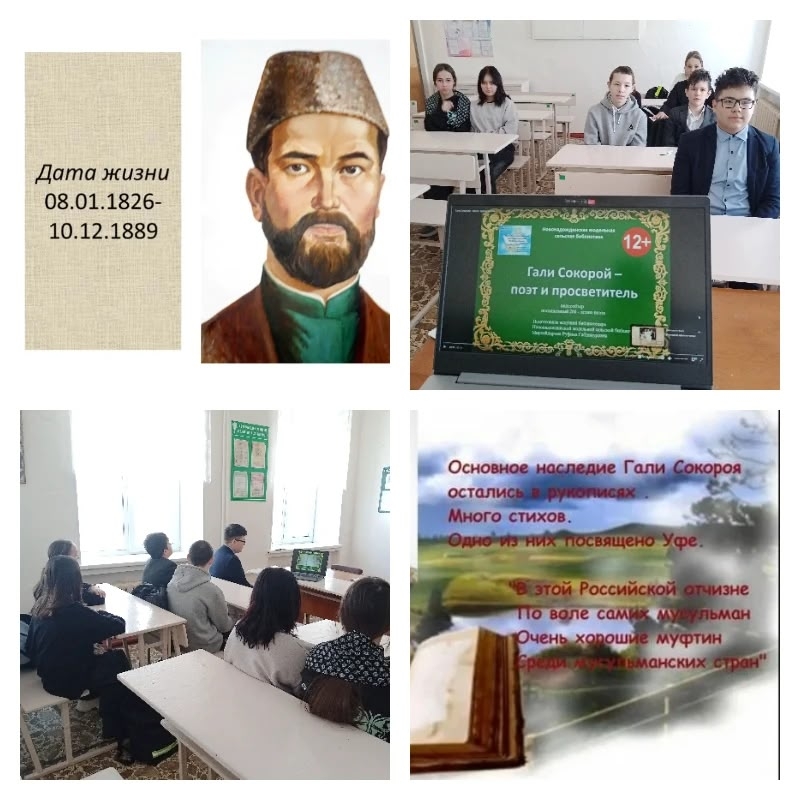 22 января в 7 классе прошёл библиотечный урок, посвящённый 200-летию Гали Сокорой (башкирский поэт, просветитель, учёный, религиозный деятель, потомок башкирского рода Кара-табын). Настоящая фамилия Гали Сокороя— Кииков Мухаметгали Габделсалихович.