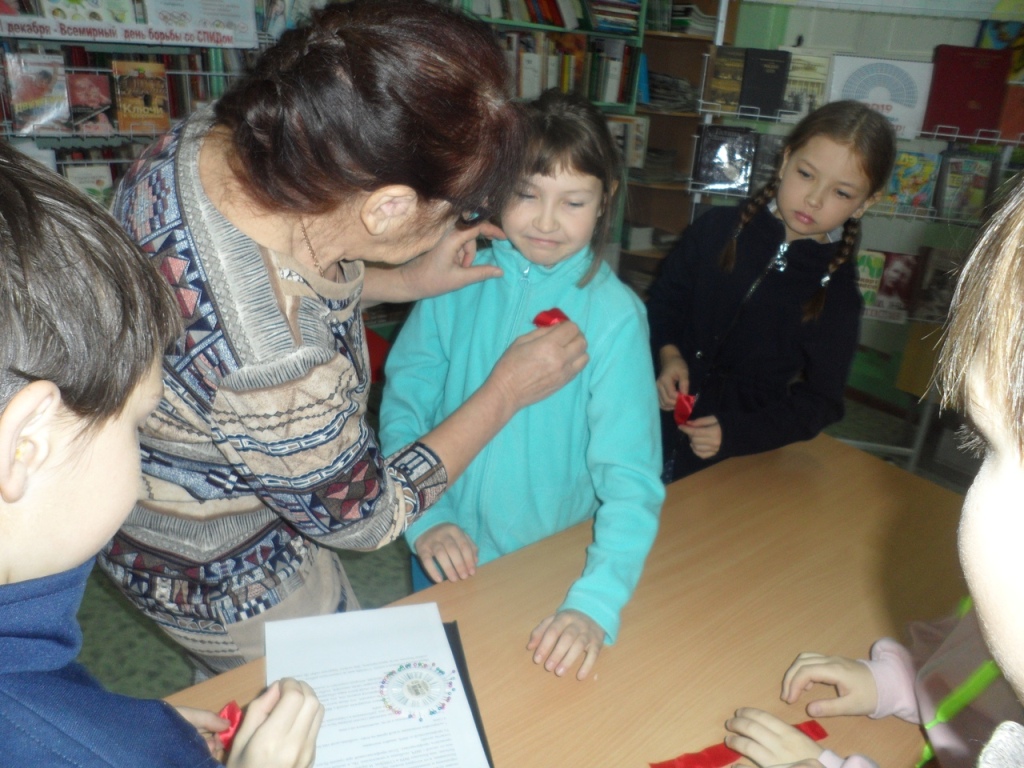 В течение дня читатели имели возможность познакомиться с материалами выставки «ВИЧ: знать, чтобы жить!». Для детей младшего школьного возраста была проведена беседа – сказка «Детям о СПИДе». Затем ребята «прошагали» по тропе здоровья, играя и разгадывая загадки, составляя свой режим дня, и выясняя, что полезно для здоровья, а что нет «вырастили» Дерево Здоровья. Все посетители библиотеки в этот день получали в подарок красные ленточки – символ борьбы со СПИДом в память о сотнях тысяч умерших от этой коварной болезни людей, и в знак солидарности с теми, кто живёт и борется с ней, а также буклеты "5 шагов, чтобы остановить ВИЧ".