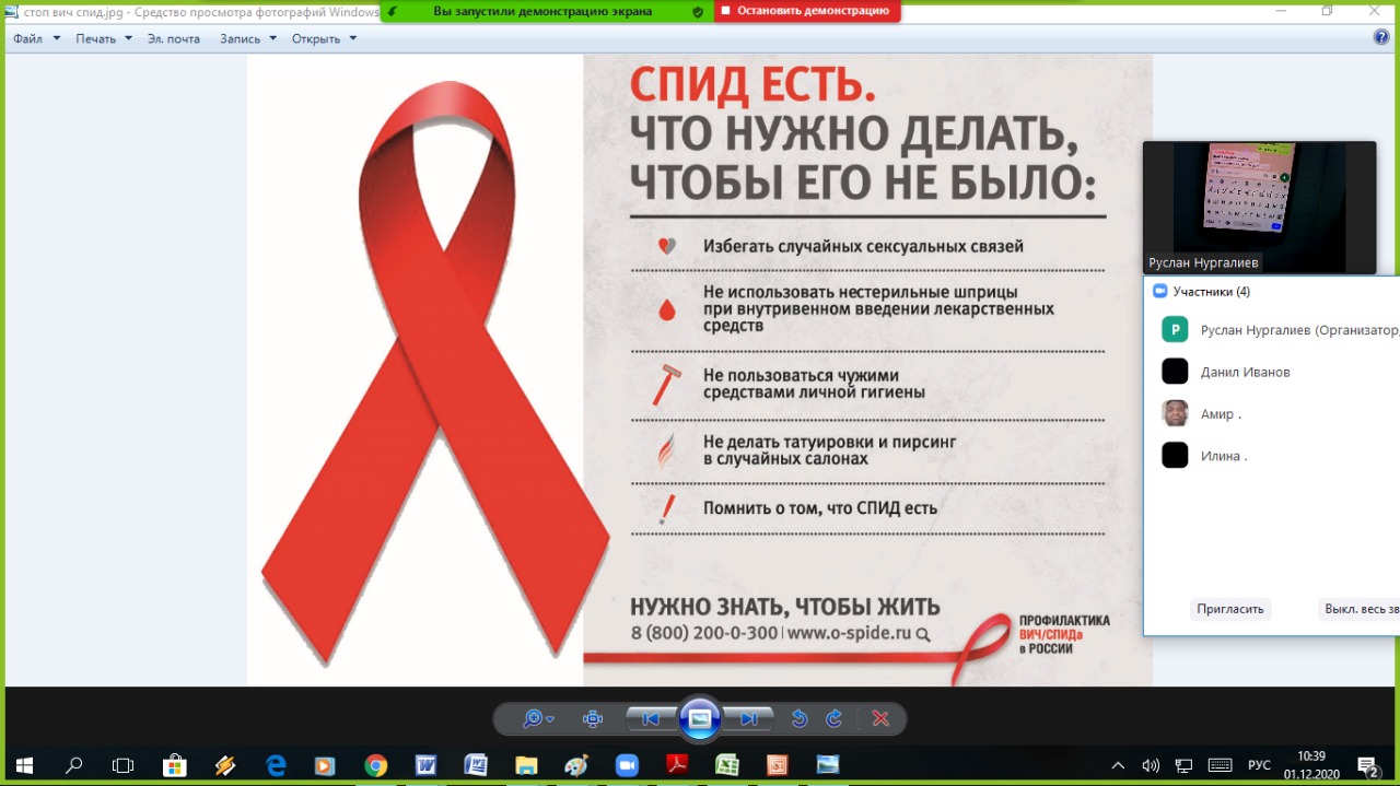 - Были проведены онлайн формате классые часы : «СПИД- реальная угроза» среди обучающихся 6-10 классов. В целях профилактики ВИЧ-инфекции в школе и информирования детей и молодежи по действенным подходам и эффективных практиках противодействия распространению ВИЧ-инфекции: путях передачи, механизмах инфицирования, социально-гуманитарных последствиях распространения, а также современных способах профилактики, лечения и тематических информационных ресурсах, ориентированных на формирование у детей и молодежи стойких поведенческих навыков, способствующих сохранению здоровья и уменьшению риска ВИЧ-инфицирования.
