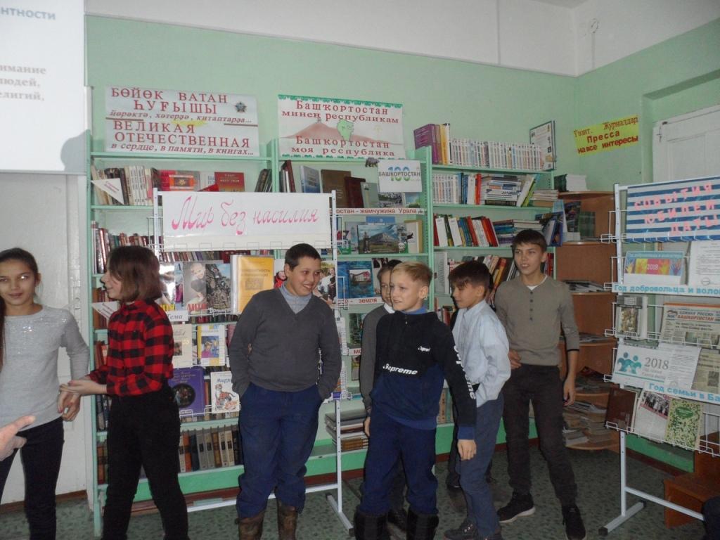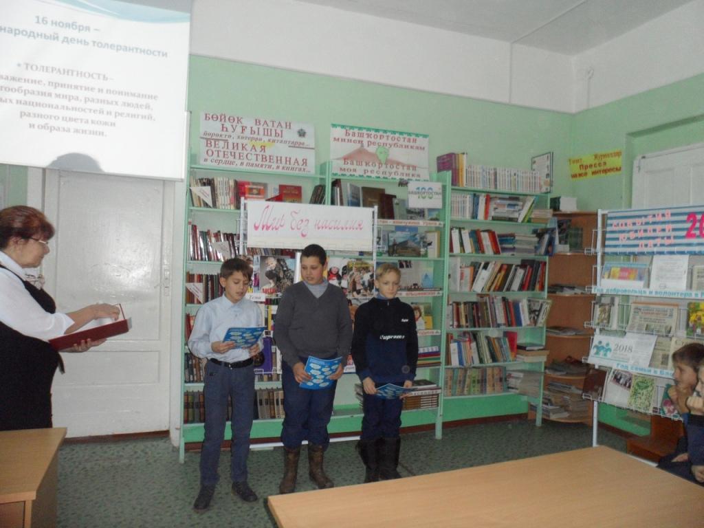 Был проведен обзор книжной выставки «Мир без насилия», интерес у ребят вызвали книги, представленные в разделе «Тема толерантности в литературе» и рекомендательном списке литературы «Толерантность в литературе», подготовленном работниками библиотеки.