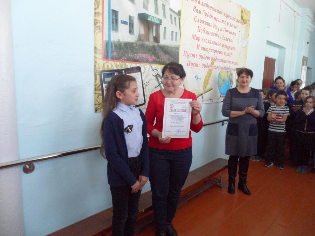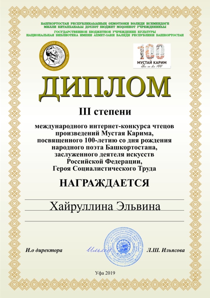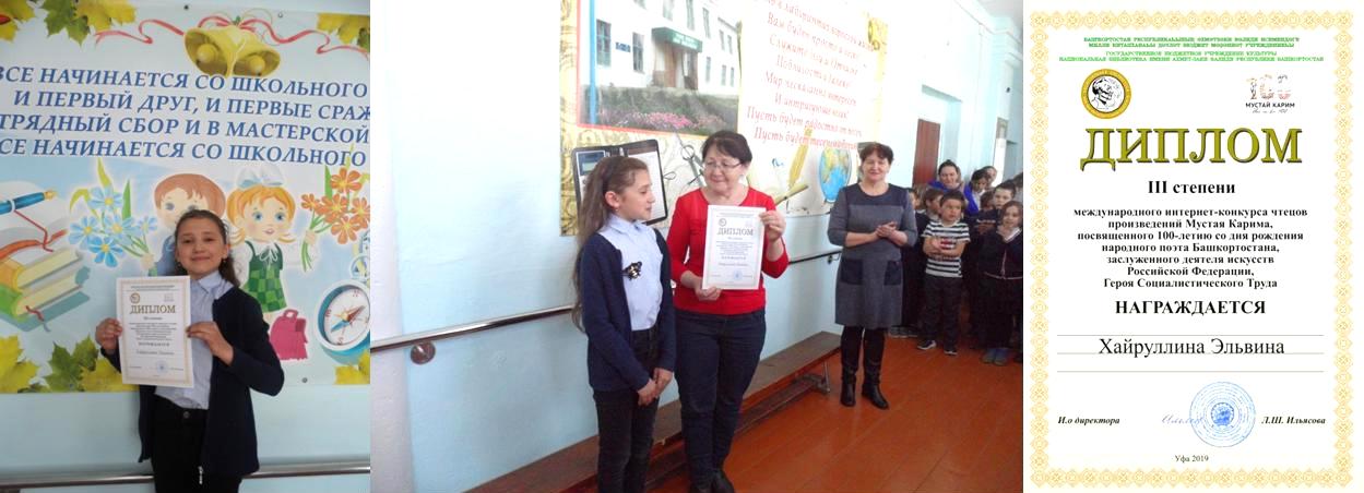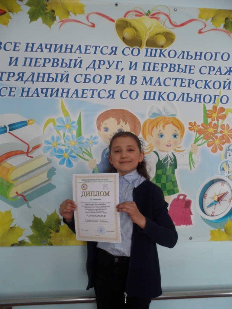 Подведены итоги Международного интернет - конкурса чтецов произведений Мустая Карима, посвящённого 100-летию со дня рождения народного поэта Башкортостана. Хайруллина Эльвина, ученица 5 кл. нашей школы заняла в этом конкурсе III место! Поздравляем от души нашу победительницу и желаем новых творческих успехов!