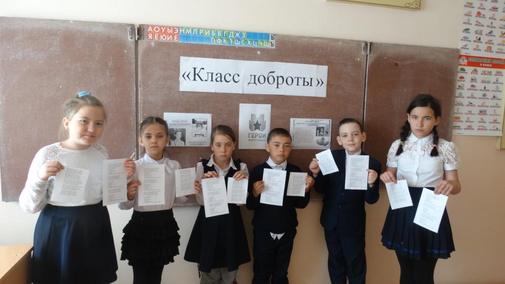 В ходе урока учащиеся узнали о юных героях Великой отечественной войны и современности. Ребята рассказывали стихи, вспоминали свои добрые дела к родителям, бабушкам, дедушкам, учителям, к людям старшего поколения. Затем школьники написали себе письма «Добро от меня».