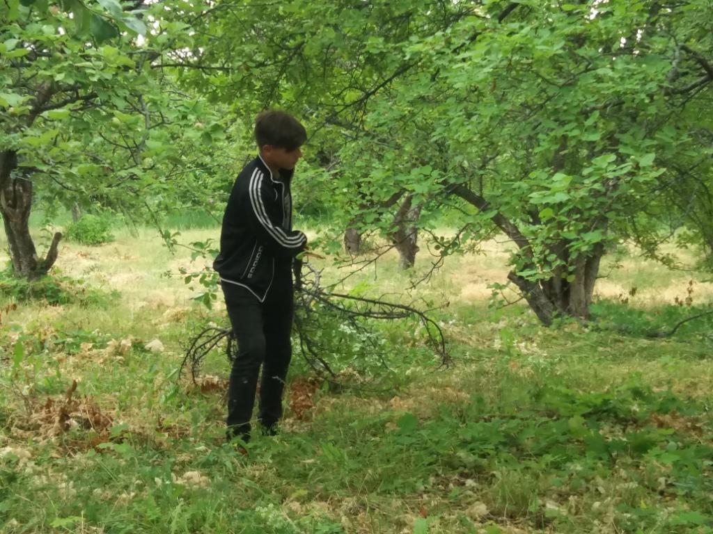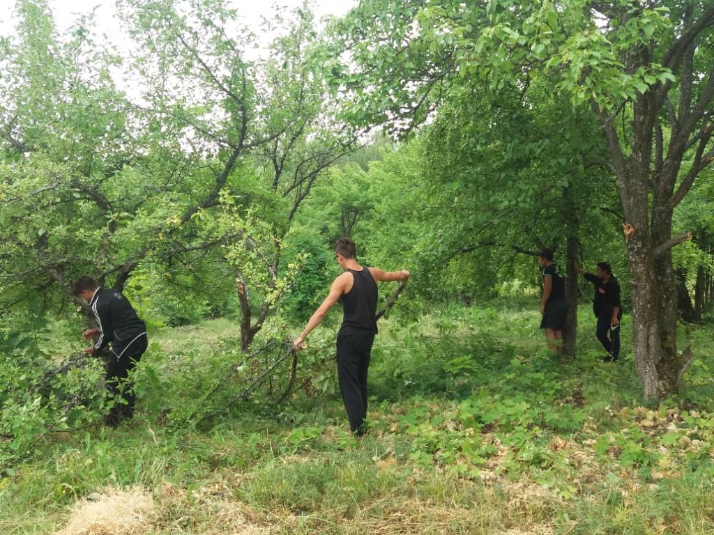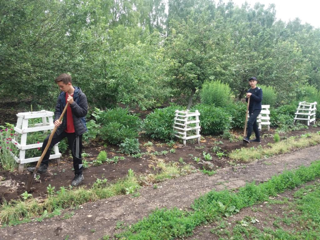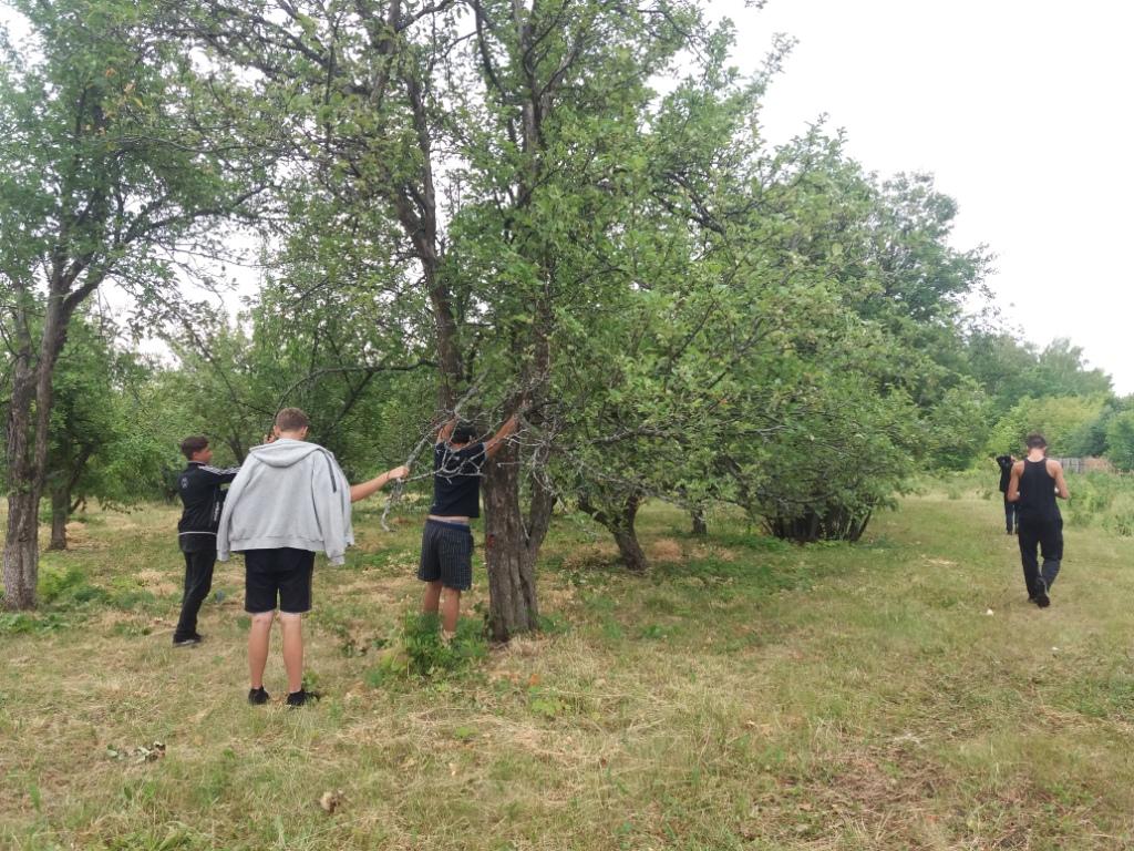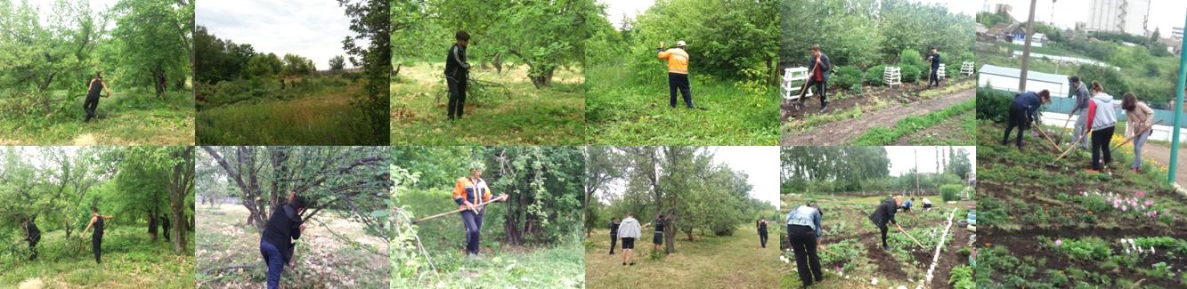 После ночного дождя день выдался пасмурным. Но, не смотря на это, как обычно ребята с энтузиазмом взялись за работу. Проредили цветы в цветниках, взрыхлили цветники, Убрали опавшие с деревьев ветки, А в саду продолжили работу по очистке плодовых деревьев от поросли и высокой травы.