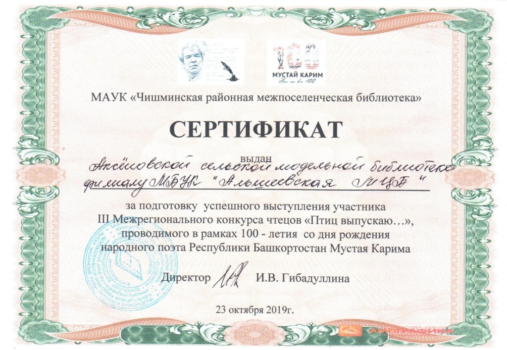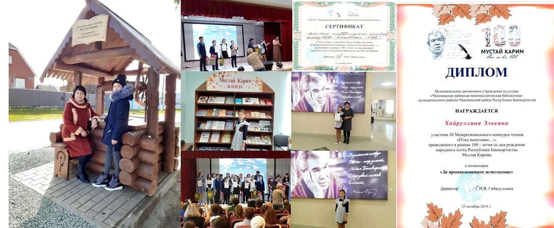 23 октября 2019 года на родине Мустая Карима в с. Кляшево прошло Гала-выступление победителей и номинантов III Межрегионального конкурса чтецов «Птиц выпускаю…», посвящённого 100 – летию народного поэта Республики Башкортостан Мустая Карима, который был организован МАУК «Чишминская районная межпоселенческая библиотека».