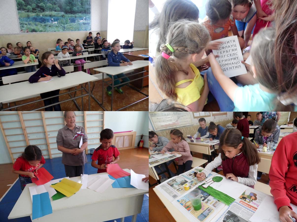 Две команды соревновались между собой. Они показали свою эрудицию, отвечая на вопросы, из цветной бумаги изготовили макет флага России, рисовали свой родной край.