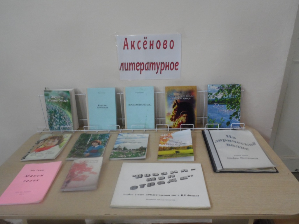 8 ноября 2019 года в селе Аксёново состоялась презентация «Мой край родной – моя история живая», на которой были представлены книги «Селу Аксёново – 130 лет» Дунина А.П., «Мы – Адигамовы» Адигамовой Р.М., фотоальбома «Моя школа в истории и лицах» Миргазова Д.С.
