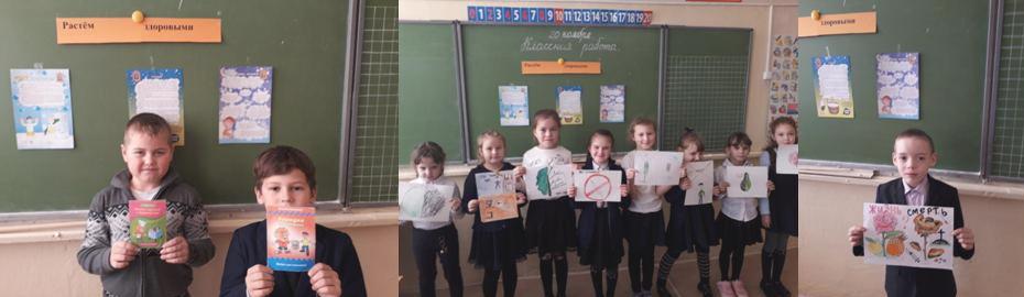 Ребята вспомнили правила закаливания и гигиены, поговорили о правильном питании. На классном часе ребята узнали о веществах, к которым может возникнуть привыкание. Дети представили свои рисунки (домашнее задание) «Нет наркотикам».