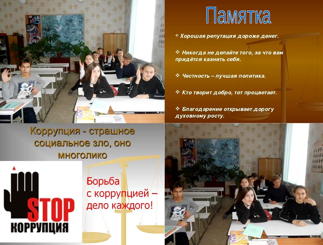 - провести беседу со старшеклассниками о проблеме противодействия коррупции и методов её предупреждения;