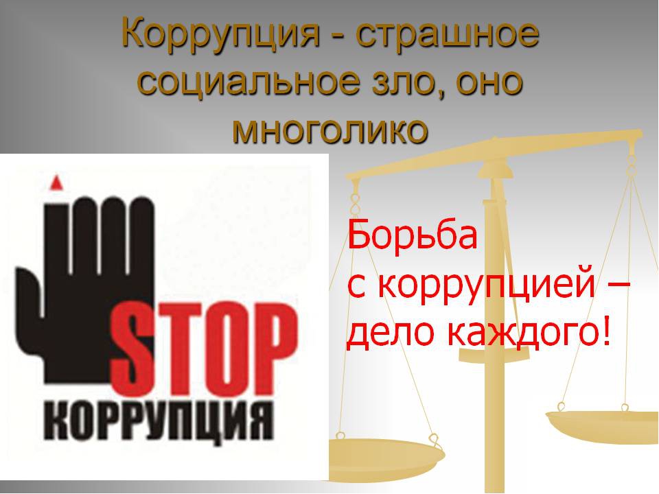 Коррупция разрушает общество изнутри. Ее можно сравнить с занозой: чем дольше она находится в тиши, тем больше ее размер и хуже последствия. Думаю, коррупцию можно победить, искоренить, лишь если взяться всем вместе.