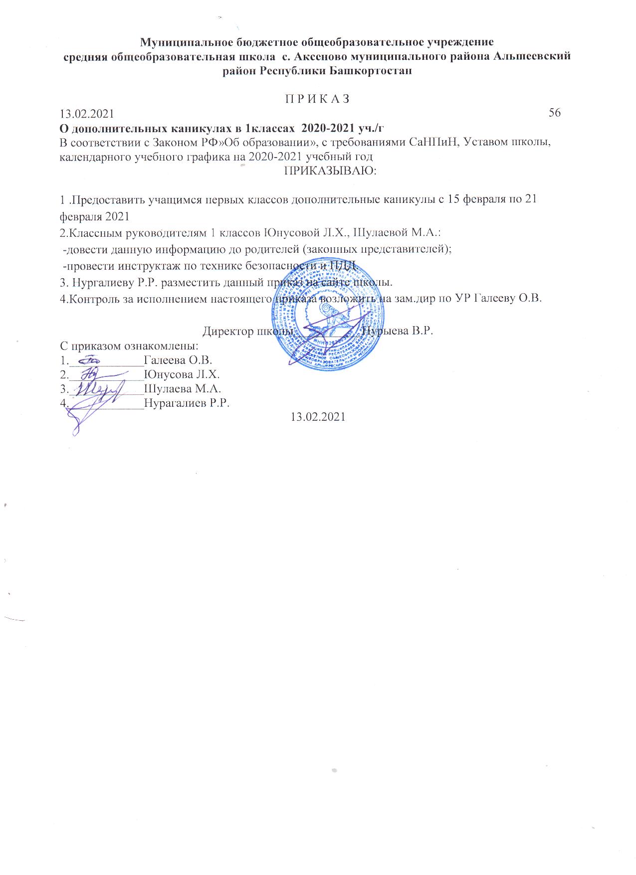 ПРИКАЗ о дополнительных каникулах в 1 классах 2021