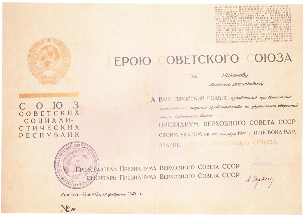 Советское правительство от 22 октября 1937 г. за отличную боевую и политическую подготовку по укреплению оборонной мощи Советского Союза, за образцовое выполнение специальных заданий командования и Советского правительства, за проявленную отвагу, мужество и героизм присвоило Алексею Васильевичу Никонову звание Героя Советского Союза (посмертно). Надо отметить, что он стал одним из первых в Башкирии, удостоенных звания Героя Советского Союза.