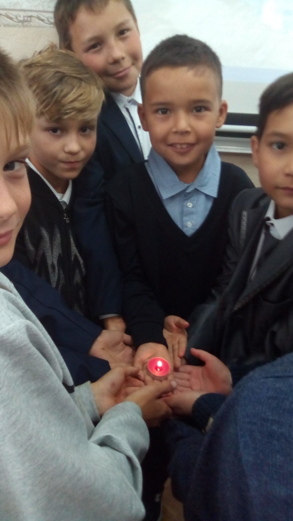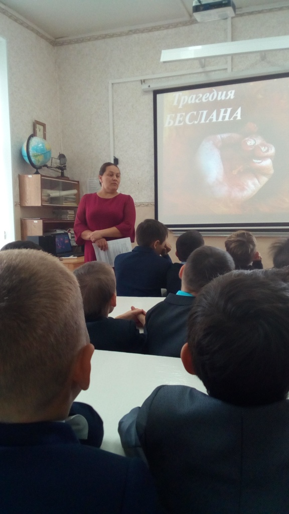 Маленьким жителям Беслана, чьи имена навсегда останутся в памяти человечества, их учителям, наставникам, до последней минуты сердцем прикрывавшим своих питомцев и разделившим тяжесть выпавших на их долю испытаний, несгибаемым отцам и матерям Беслана – всем тем, кто погиб в темном пекле пылающего ада и кто выжил в эти страшные сентябрьские дни, посвятили мы наш классный час. Учащиеся вспомнили события трёх страшных дней в истории маленького городка.  Памяти жертв бесланской трагедии, памяти всех жертв терроризма – прошла минута молчания,  были зажжены свечи памяти.  А также  были проведены беседа и инструктаж по антитеррористической и личной безопасности учащихся.