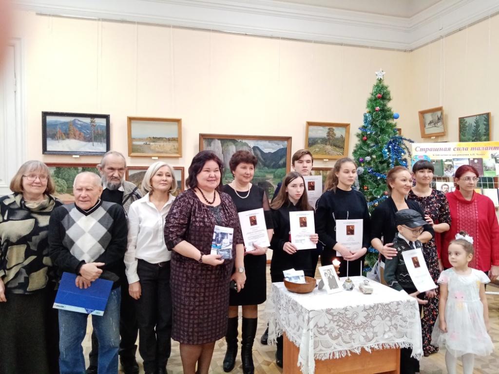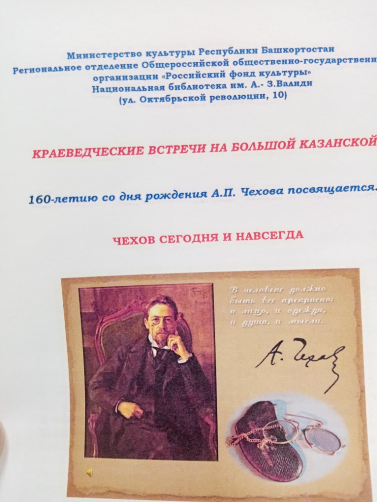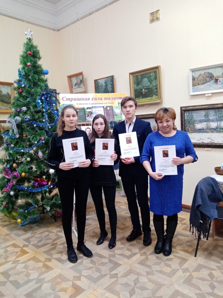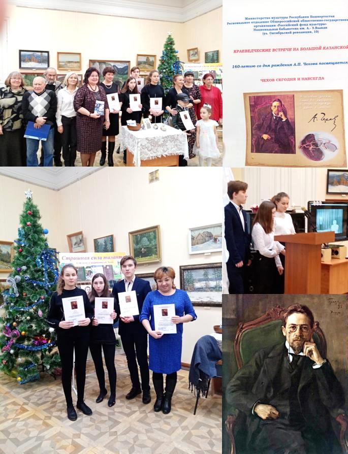 Наши учащиеся Ахметвалиева Р., Хафизова А. и Шияпов Б. приняли участие. На литературно-музыкальном вечере, посвященном 160 - со дня рождения А.П.Чехова мы представили исследовательскую работу на тему «Чехов и Ольга Книппер». В бывшем особняке лесопромышленника Чижова 19 века, где сейчас располагается библиотека, царила атмосфера радушия, величественности и добра.