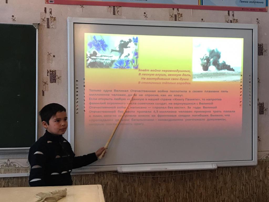 В ходе проведения классных часов, бесед, показа презентаций, было рассказано об исторических событиях Второй Мировой войны, были затронуты актуальные темы по воспитанию чувства патриотизма и гордости за свое Отечество у подрастающего поколения.